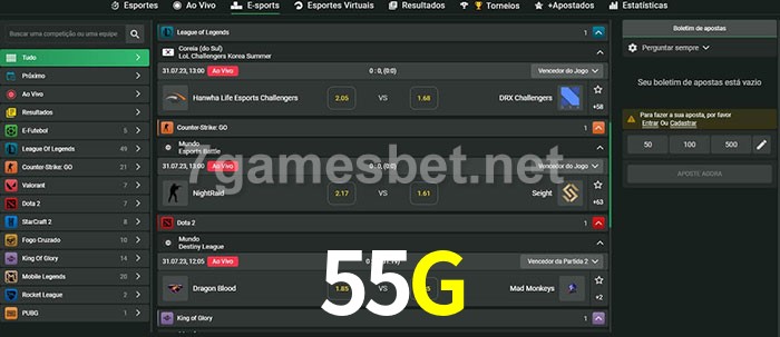 O 55G oferece uma grande seleção de opções de apostas em e-sports com probabilidades competitivas